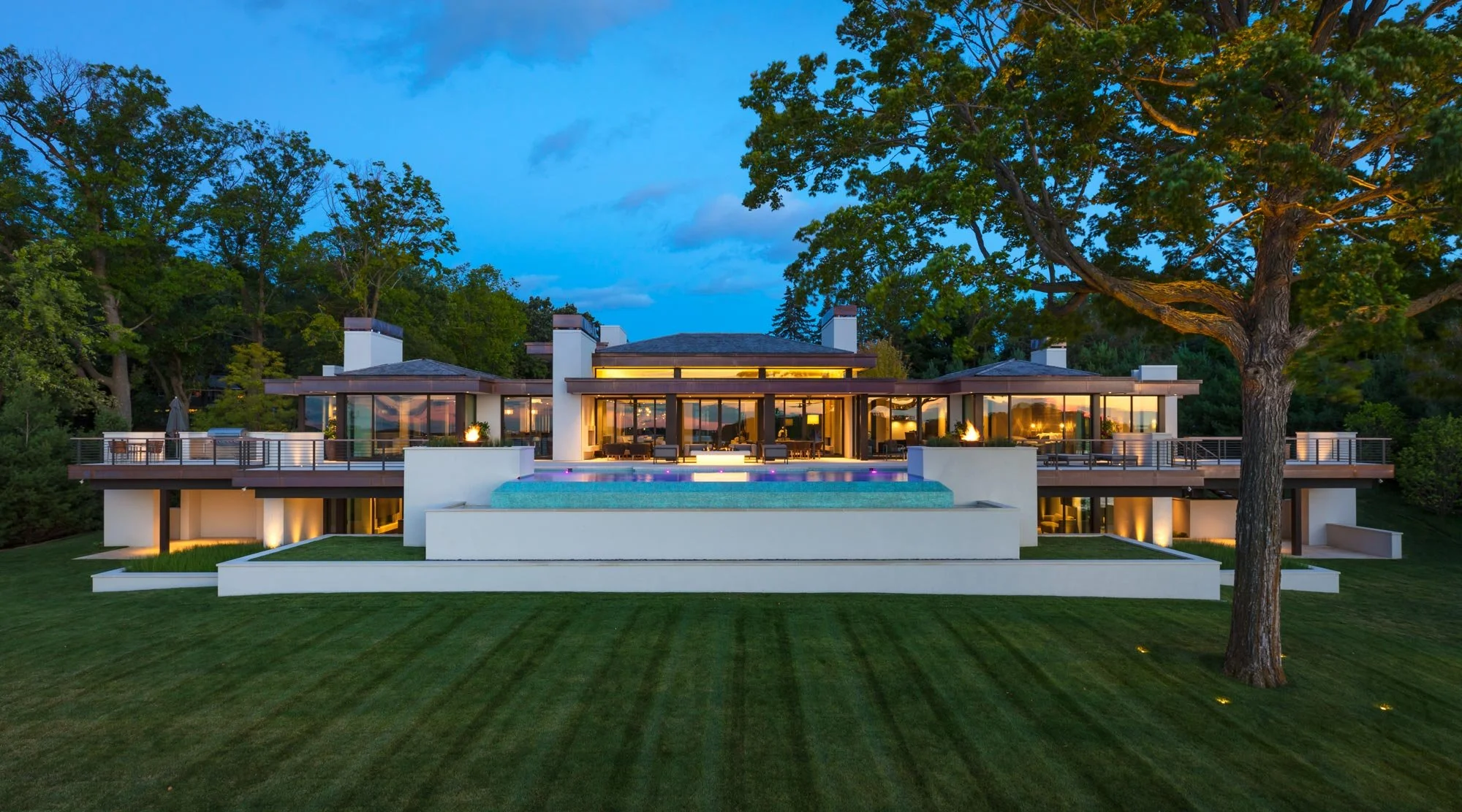 Copper edging reflects the golden hues of sunlight shaping this elegant, elongated, lake home design. A series of hip roofs mimic the water and shoreline, adding to the graceful flow. Exterior finishes are warm and modern and use natural materials like stone and copper. An infinity pool and deck span the length of the house and open to the lake beyond. Inside, natural light bathes the interior through a light well that rises above the roof. Gallery-like spaces provide ample display area for art, while some walls are designed to be artful themselves, featuring beautiful finishes in venetian plaster and specialty paints.